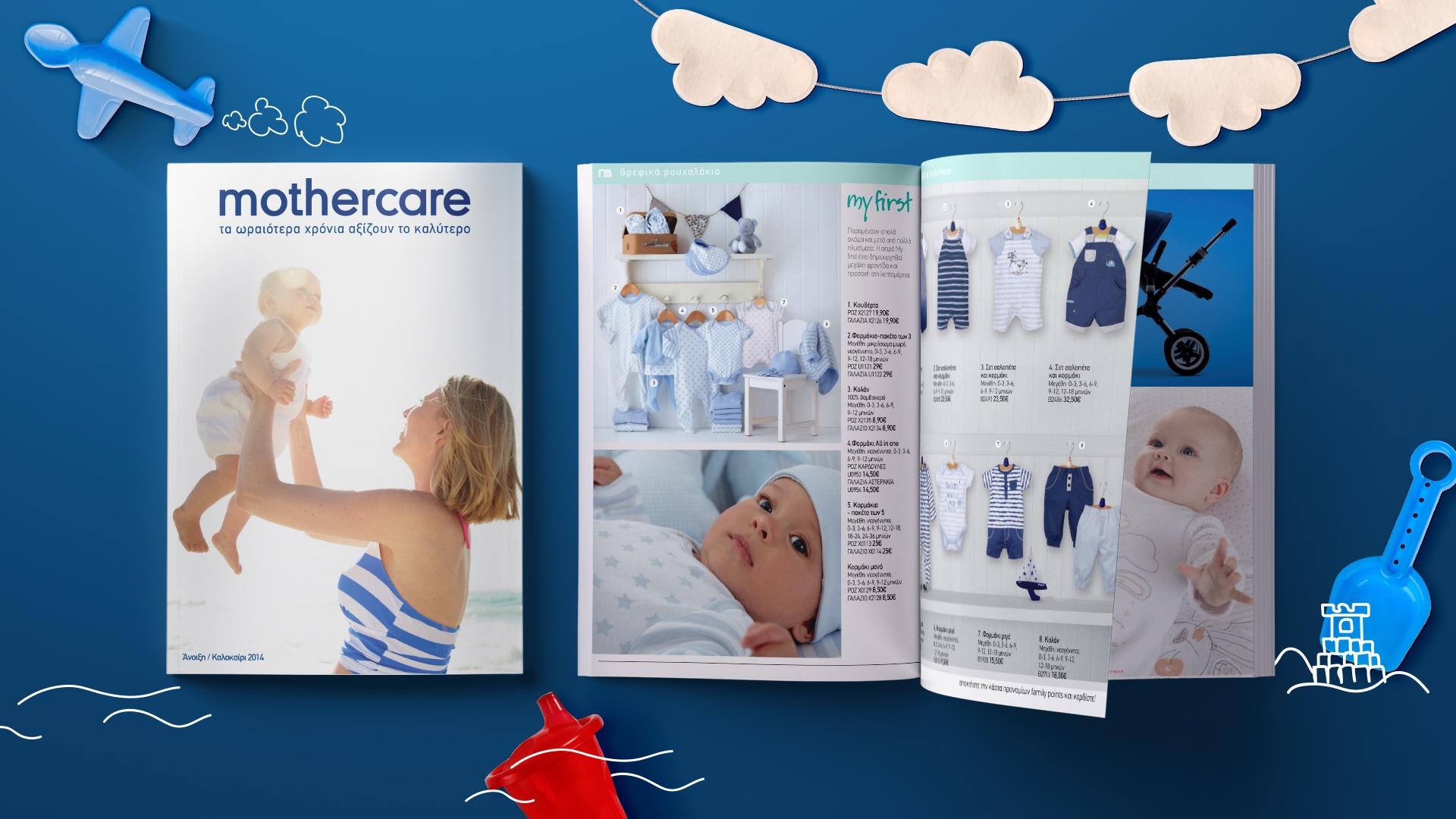 Η mothercare ιδρύθηκε το 1961, είναι συνώνυμη με τη μητρική φροντίδα, ενώ αποτελεί αγαπημένο προορισμό των μαμάδων και των μπαμπάδων για πάνω από 50 χρόνια. Η mothercare είναι το ιδανικό κατάστημα για να καλύψει τις καθημερινές ανάγκες των γονέων, συμπεριλαμβανομένων βραβευμένων συλλογών ρούχων, ποιοτικών προϊόντων για το σπίτι και τα ταξίδια. Το 2007 η εταιρία καλωσόρισε το Early Learning Center, το ποιοτικό brand βρεφικών και παιδικών παιχνιδιών. Ως κορυφαίος λιανοπωλητής για τη mothercare, οι κατάλογοι αποτελούν καθοριστικό παράγοντα πωλήσεων. Πάνω σε αυτές τις κατευθυντήριες γραμμές, μας ανατέθηκε να σχεδιάσουμε τους θεματικούς καταλόγους mothercare & ELC για την ελληνική αγορά. Ακολουθώντας τις αρχές προώθησής της, η ομάδα σχεδιασμού μας κατάφερε να δημιουργήσει μια σειρά διαφορετικών στησιμάτων που ανταποκρινόταν στοχευμένα στην έντυπη προβολή της ευρείας γκάμας των προϊόντων, αρμονικά οργανωμένα ώστε να βοηθήσουν τους γονείς να κάνουν την έρευνα αγοράς τους, να δουν και να προβούν σε αγορές.